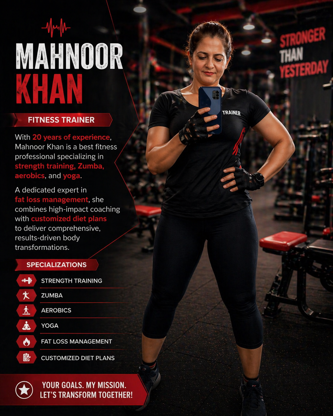 Mahnoor Khan brings 20 years of professional fitness experience, helping clients improve strength, endurance, flexibility, and overall health. Her expertise includes strength training, Zumba, aerobics, yoga, fat loss management, and customized diet planning. With a practical and results-focused coaching style, she supports members in achieving sustainable and effective body transformation.